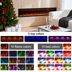 Up to 507 color combinations, including 13 flame colors, 13 ember bed colors, and 3 top light colors, allowing you to customize the ambiance for almost any occasion. Crystal and log decorations can be freely arranged for wall-mounted or built-in installation. Flame and lighting effects can operate independently without heating.
